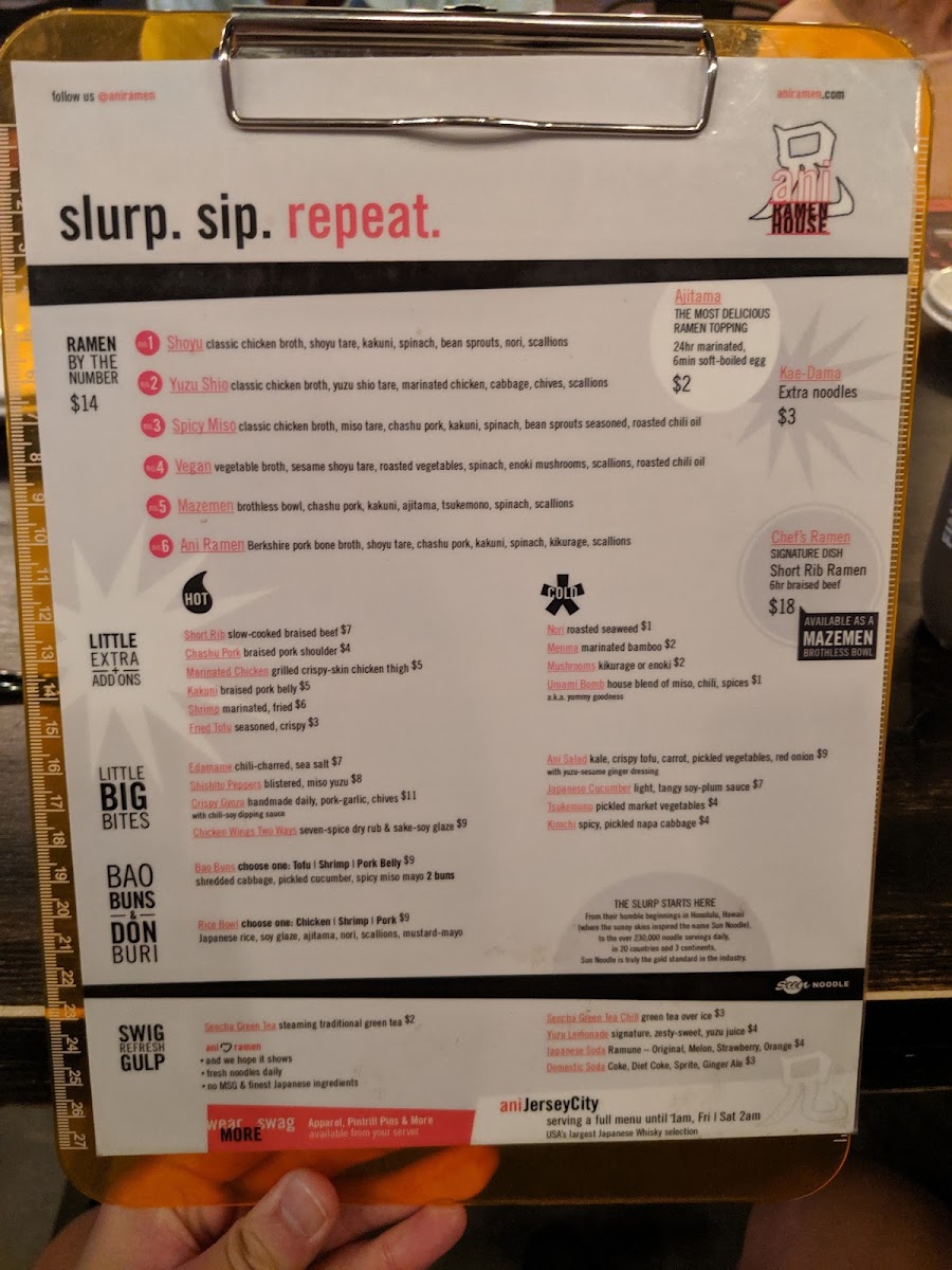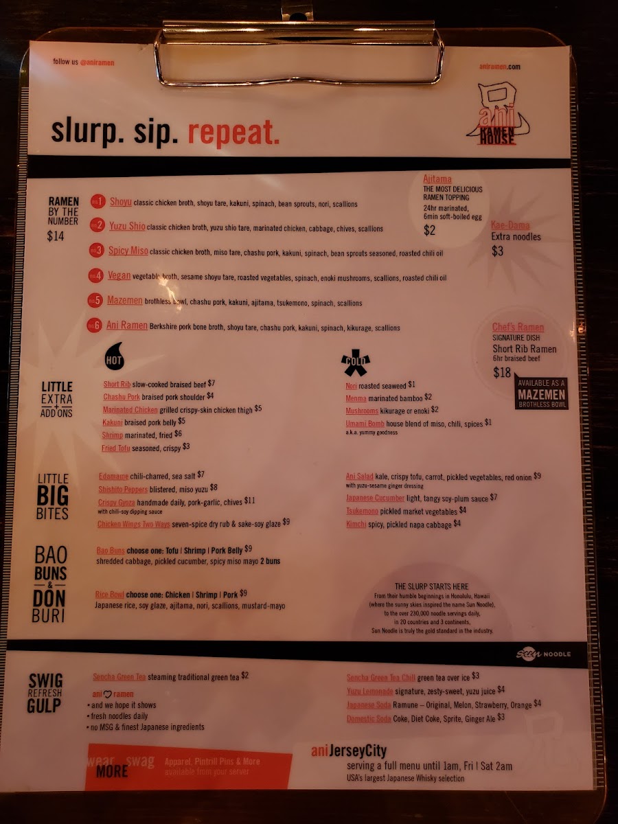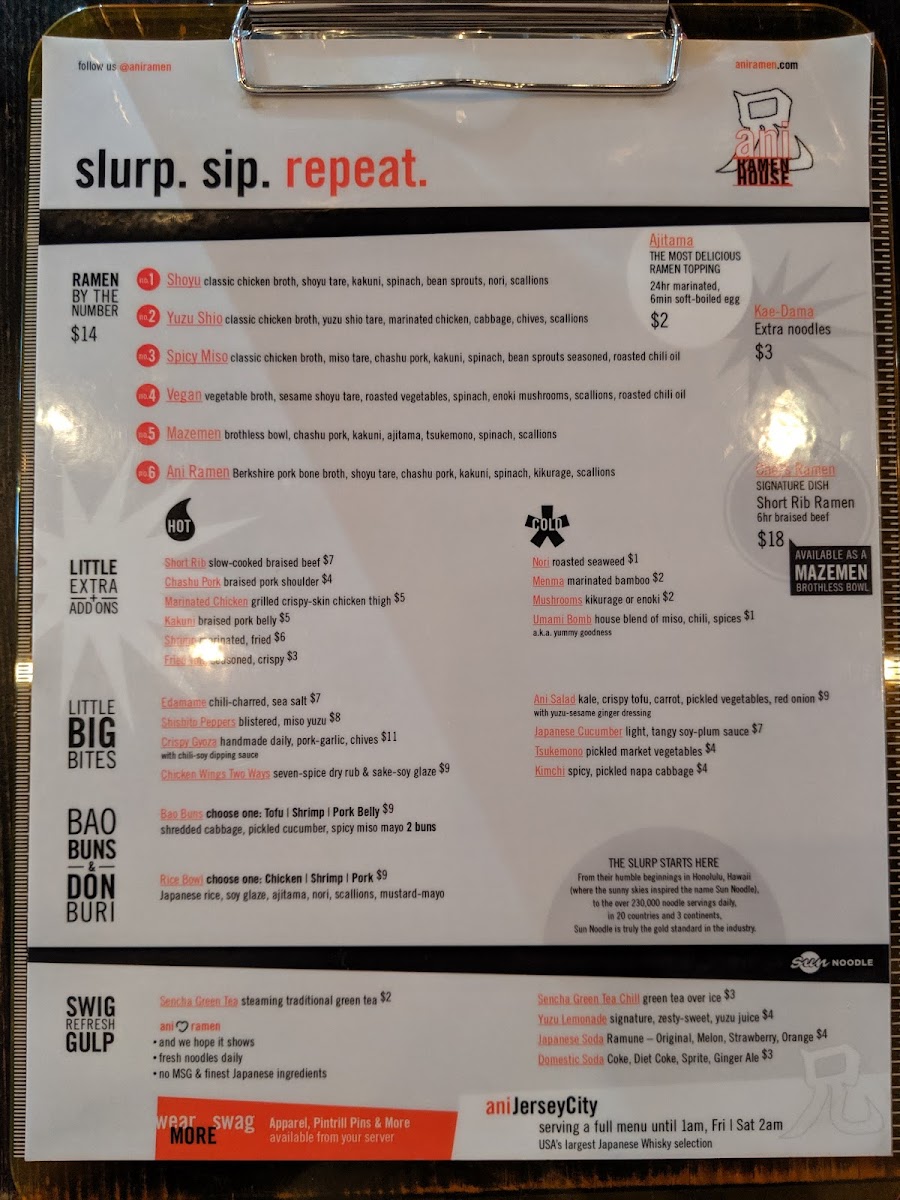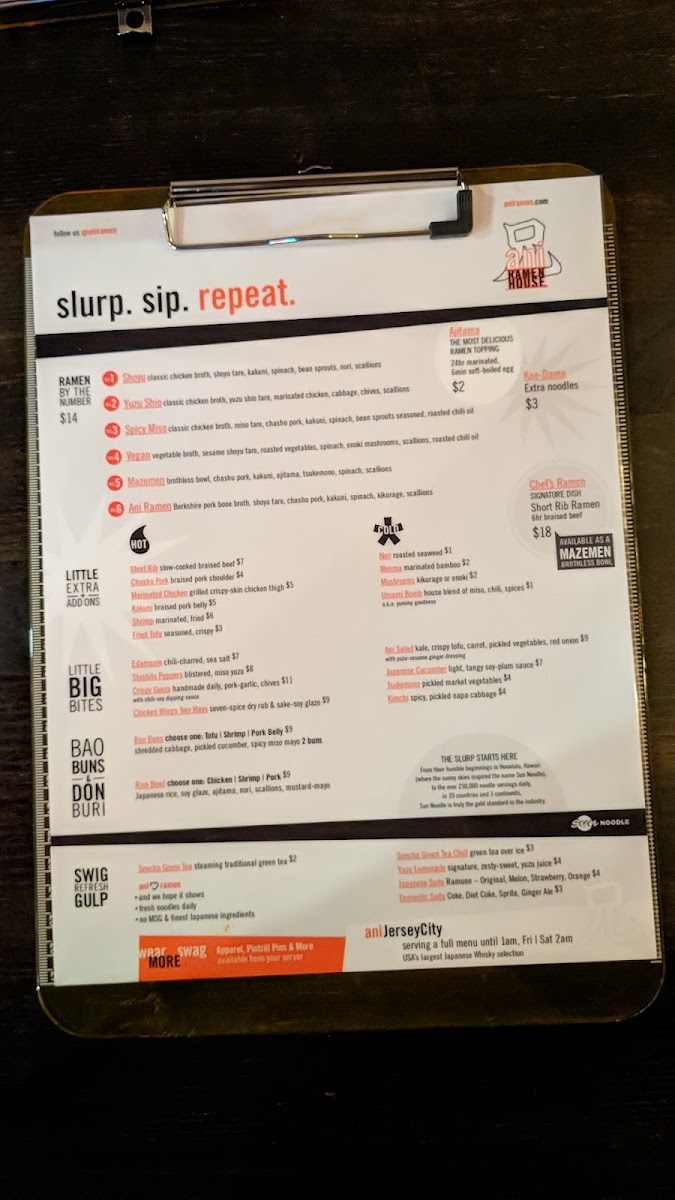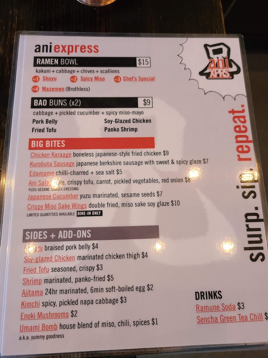 From a reviewer’s perspective, the menu at Ani Ramen House at 427 Springfield Ave, Summit, NJ delivers a confident, well-rounded snapshot of modern ramen dining, balancing comfort classics with playful variety. It begins with the Big Bites, where Chicken Karaage, Kurobuta Sausage, Edamame Ani Salad, and Japanese Cucumbers set the tone-snackable, savory starters that prime the palate without overshadowing the mains. The Bao Buns section adds a crowd-pleasing, handheld dimension, featuring Pork Buns, Shrimp Buns, Chicken Karaage Buns, Tofu Buns, and Kimchi Buns, each offering a different texture and flavor profile that pairs perfectly with the restaurant’s brothy core. Ramen lovers will find the heart of the menu in the noodle lineup, with options like Panko Shrimp Kimchi Ramen, Shoyu Ramen, Spicy Miso Ramen, Chef’s Special Ramen, and Vegan Ramen, ensuring there’s something for traditionalists, spice seekers, and plant-based diners alike. For those craving rice-forward comfort, the Rice Bowls-including the Chicken Bowl, Pork Bowl, Shrimp Bowl, and Tofu Bowl-provide satisfying alternatives that still reflect Ani’s Japanese-inspired focus. Customization and sharing are made easy through Sides + Add-ons such as Side Kakuni, Side Soy Glazed Chicken, Side Shrimp, Side Ajitama (6 minute egg), and Side of Mushrooms, letting diners tailor their meal or add extra indulgence. To round things out, the Beverages-Can of Soda (12 oz), Can of Seltzer (12 oz), and Japanese Ramune Soda-keep it simple and refreshing, while the playful Ani Swag (3PD) items like Ani Beanie, Ani Mask, Ani Logo Hoodie, Ani We Love Ramen Hoodie, and Ani Orange Buns Tee extend the brand beyond the bowl. As a conclusion, Ani Ramen House’s menu feels thoughtfully curated and cohesive, offering depth, flexibility, and personality-exactly what you want from a neighborhood ramen spot that knows its identity and executes it with confidence.