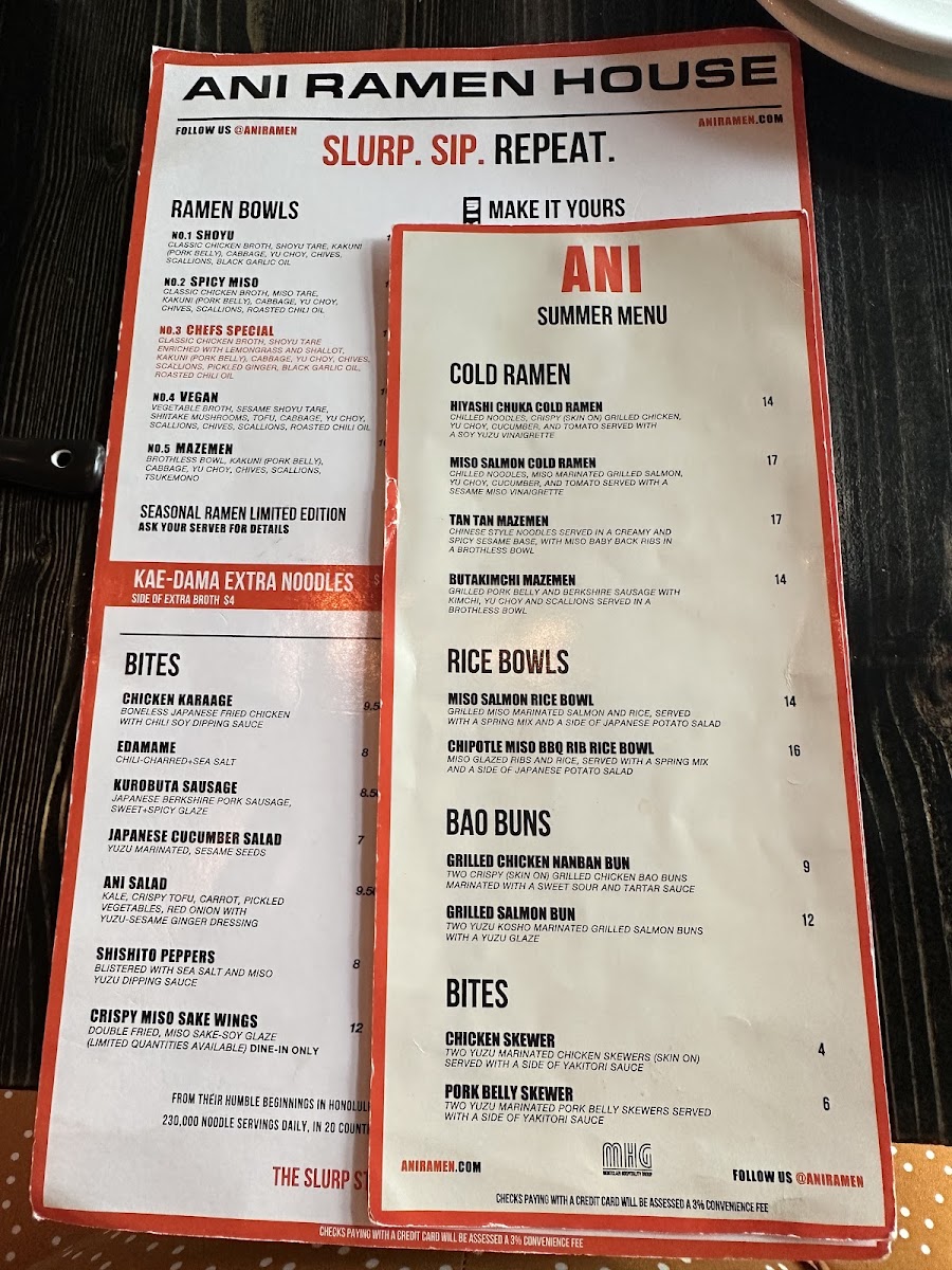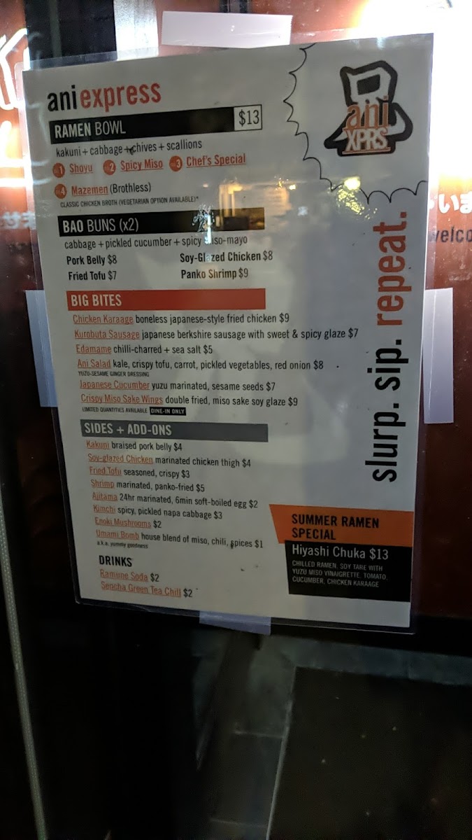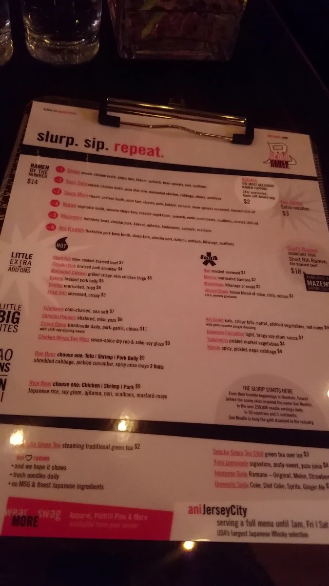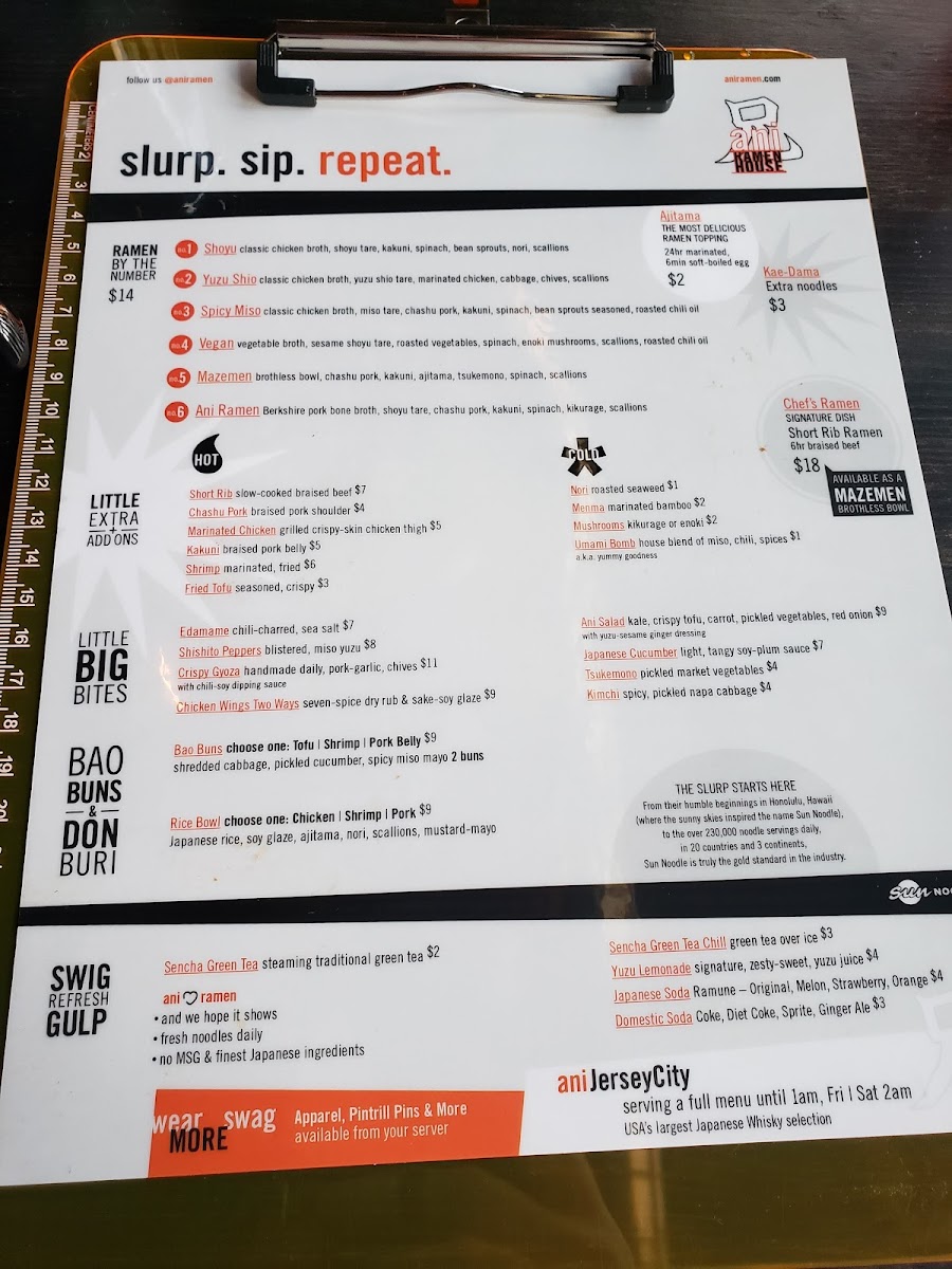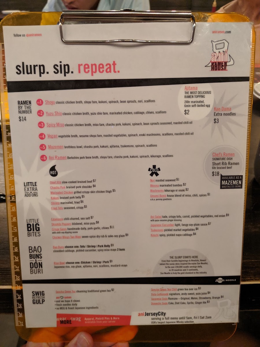 From a reviewer’s perspective, the menu at Ani Ramen House at 427 Springfield Ave, Summit, NJ delivers a confident, well-rounded snapshot of modern ramen dining, balancing comfort classics with playful variety. It begins with the Big Bites, where Chicken Karaage, Kurobuta Sausage, Edamame Ani Salad, and Japanese Cucumbers set the tone-snackable, savory starters that prime the palate without overshadowing the mains. The Bao Buns section adds a crowd-pleasing, handheld dimension, featuring Pork Buns, Shrimp Buns, Chicken Karaage Buns, Tofu Buns, and Kimchi Buns, each offering a different texture and flavor profile that pairs perfectly with the restaurant’s brothy core. Ramen lovers will find the heart of the menu in the noodle lineup, with options like Panko Shrimp Kimchi Ramen, Shoyu Ramen, Spicy Miso Ramen, Chef’s Special Ramen, and Vegan Ramen, ensuring there’s something for traditionalists, spice seekers, and plant-based diners alike. For those craving rice-forward comfort, the Rice Bowls-including the Chicken Bowl, Pork Bowl, Shrimp Bowl, and Tofu Bowl-provide satisfying alternatives that still reflect Ani’s Japanese-inspired focus. Customization and sharing are made easy through Sides + Add-ons such as Side Kakuni, Side Soy Glazed Chicken, Side Shrimp, Side Ajitama (6 minute egg), and Side of Mushrooms, letting diners tailor their meal or add extra indulgence. To round things out, the Beverages-Can of Soda (12 oz), Can of Seltzer (12 oz), and Japanese Ramune Soda-keep it simple and refreshing, while the playful Ani Swag (3PD) items like Ani Beanie, Ani Mask, Ani Logo Hoodie, Ani We Love Ramen Hoodie, and Ani Orange Buns Tee extend the brand beyond the bowl. As a conclusion, Ani Ramen House’s menu feels thoughtfully curated and cohesive, offering depth, flexibility, and personality-exactly what you want from a neighborhood ramen spot that knows its identity and executes it with confidence.